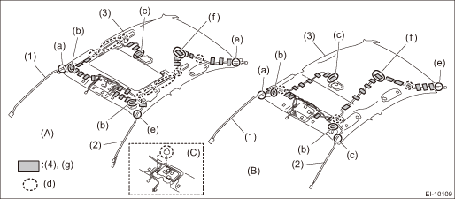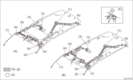 1. Install the trim panel - roof assembly. (1) Bring the trim panel - roof assembly inside the vehicle. (2) Attach the feeder cord and roof cord to the roof trim. CAUTION: Route each cord carefully. The cord may interfere, thus preventing normal deployment of the curtain airbag when necessary. Tape: Item number: 86359SC000/TAPE NOTE: Use the tape (service parts) by cutting into 80 mm - 50 mm (3.1 in - 2.0 in).