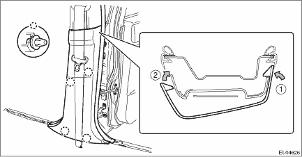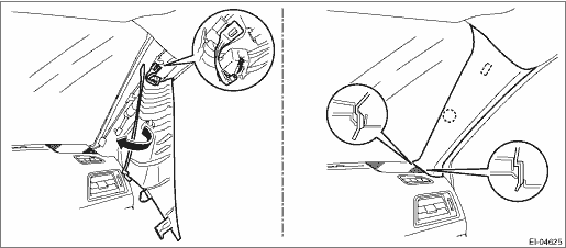 1. Remove the remaining tether clips from the vehicle body. 2. Install the trim panel - front pillar UPR. (1) Hook the tip of the tether clip on the trim panel - front pillar UPR. (2) Rotate the trim panel - front pillar UPR in the arrow direction as shown in the figure. (3) Insert the claw at the end of the trim panel - front pillar UPR, and engage the clip.