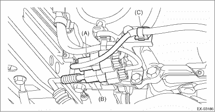 3. Lift up the vehicle. 4. Connect the front oxygen (A/F) sensor connector, and secure the front oxygen (A/F) sensor harness by using the clip.