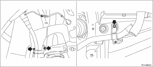 1. Open the fuel filler lid. 2. Insert the fuel filler pipe from inside of the rear fender. 3. Install the fuel filler pipe to the vehicle body and connect the evaporation hose (A) to the fuel filler pipe. Tightening torque: 7.5 N·m (0.8 kgf-m, 5.5 ft-lb)