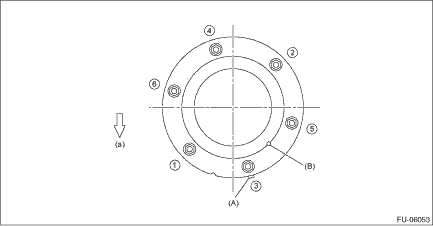 1. Install the fuel sub level sensor to the fuel tank. CAUTION: Set the arm and float of the fuel sub level sensor while paying attention to prevent them from contacting the fuel tank. If the arm of the fuel sub level sensor is bent, the fuel gauge may not read correctly. NOTE: Use a new gasket. (1) Make sure the sealing portion is free from fuel or foreign matter before installation. (2) Align protrusion (A) of the gasket to the position shown in the figure. (3) Align the cutout of fuel sub level sensor upper plate cushion with the protrusion (B) of fuel sub level sensor. (4) Align the protrusion (B) of fuel sub level sensor upper plate cushion with the cutout of fuel sub level sensor upper plate. (5) Tighten the nuts to the specified torque in the order as shown in the figure. Tightening torque: 4.4 N·m (0.4 kgf-m, 3.2 ft-lb)