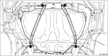 1. Support the fuel tank with a transmission jack, set the fuel tank and the fuel tank band in place, and temporarily tighten the bolts of the fuel tank band. WARNING: A helper is required to perform this work.