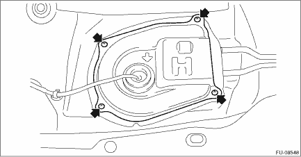 5. Move the fuel tank so that the distance between the center of the positioning hole for the body (A) and the front end of the fuel tank flange (B) becomes L, and tighten the bolts of the fuel tank bands in the sequence shown in the figure. CAUTION: To prevent the fuel tank from damage, after tightening the bolts of the fuel tank bands, make sure that the distance between the center of the positioning hole for the body (A) and the front end of the fuel tank flange (B) is L. Distance L: Center of the positioning hole for the body (A) — Front end of the fuel tank flange (B) 14.5 mm (0.571 in) or less Tightening torque: 33 N·m (3.4 kgf-m, 24.3 ft-lb)
