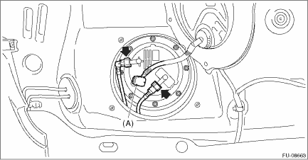 1. Install the fuel pump assembly to the fuel tank. CAUTION: Set the arm and float of the fuel level sensor while paying attention to prevent them from contacting the fuel tank. If the arm of the fuel level sensor is bent, the fuel gauge may not read correctly. NOTE: Use a new gasket. (1) Make sure the sealing portion is free from fuel or foreign matter before installation. (2) Align the recess of the fuel pump upper plate cushion to the protrusion (A) of the fuel pump assembly. (3) Keeping the cutout (B) of the fuel pump upper plate facing toward the rear of the vehicle, align the protrusion (C) of the fuel pump upper plate cushion to the cutout. (4) Tighten the nuts to the specified torque in the order as shown in the figure. Tightening torque: 4.4 N·m (0.4 kgf-m, 3.2 ft-lb)