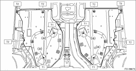 1. Install the fuel tank protector. NOTE: Use a new self-locking nut (a). Tightening torque: T1: 9 N·m (0.9 kgf-m, 6.6 ft-lb)