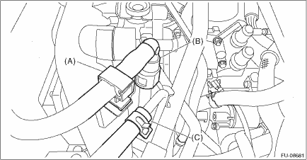 7. Connect the fuel delivery tube and evaporation hose. (1) Connect the evaporation hose (C) to the fuel pipe assembly. (2) Connect the quick connector of the fuel delivery tube (B) to the fuel pipe assembly, and secure the fuel delivery tube using clip (A). CAUTION: • Check that there is no damage or dust on the quick connector. If necessary, clean the seal surface of the pipe. • Make sure that the quick connector is securely connected.
