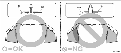 CAUTION: Install the mud guard - front so that the front end of the mud guard (b) comes outside the bumper face - front (a).