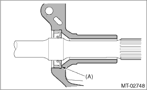 3. Fit the transmission case knock pin to the knock pin hole of the needle bearing outer race and install the main shaft assembly. NOTE: • Align the end face of the seal with surface (A) when installing the oil seal.
