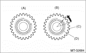 NOTE: Rotate the reverse idler sub gear by two teeth from free status in the direction of the arrow to make it engage with the reverse gear of the main shaft and install the main shaft assembly.