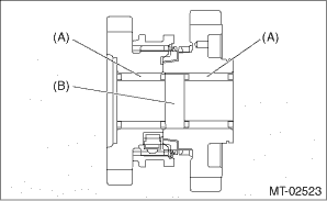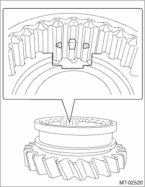 2. Assembling reverse idler gear assembly (1) Install the reverse coupling sleeve to the reverse idler gear No. 2. NOTE: • Install the reverse coupling sleeve in the correct direction. • Make sure that the oval-shaped cutout portion inside the reverse coupling sleeve matches the center of the reverse idler gear No. 2 groove.