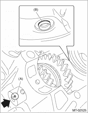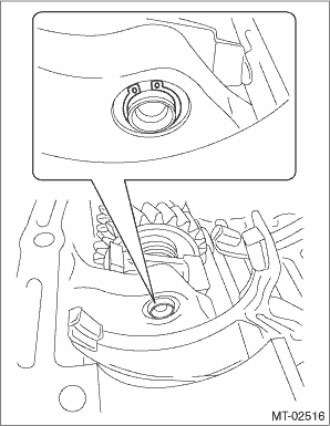 7. Select the reverse idler gear bushing. Reverse Idler Gear > ADJUSTMENT 8. Remove the reverse idler gear assembly and replace with the selected bushing. Reverse Idler Gear > REMOVAL 9. Install the reverse idler gear assembly, oil case guide and reverse idler gear shaft. NOTE: • Install with the cutout portion of the reverse idler gear shaft facing the RH side of the transmission case. • Make sure that the groove of the reverse idler gear shaft comes out of the reverse idler gear bushing. • Insert the cutout portion of the reverse idler gear bushing into the oil case guide.
