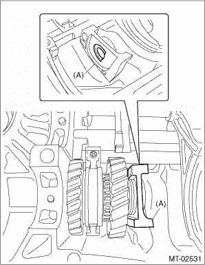 3. Install the assembled reverse idler gear assembly to the transmission case and hold it with hands. 4. Install the reverse idler gear shaft. NOTE: • Install with the cutout portion of the reverse idler gear shaft facing the RH side of the transmission case. • Make sure that the groove of the reverse idler gear shaft comes out of the reverse idler gear bushing.