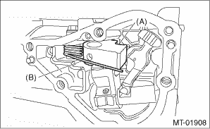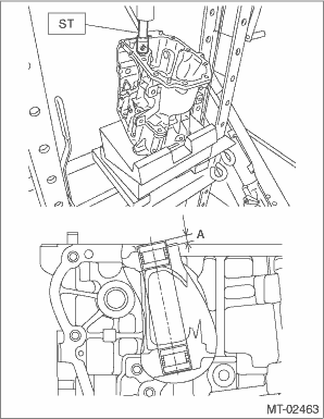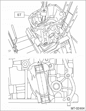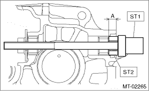 6. Flip over the transfer case, and set an iron plate between transfer case and ST. NOTE: • Insert the iron plate which is thicker than the exposed length of the transfer case knock pin between the ST and transfer case. • Set the parts while taking care that the transfer case knock pin and the roller bearing do not ride over the iron plate. 7. Using the ST, install the roller bearing. NOTE: • Use a new roller bearing. • Gradually perform the press-fit operation while measuring the press-fit depth. • If the press-fit depth exceeds the service limit, replace with a new bearing.