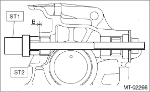 4. Set ST1, ST2 and transfer case to a press. NOTE: • Set the ST2 under ST1. • Set the transfer case so that the hole for shifter arm is positioned vertically.