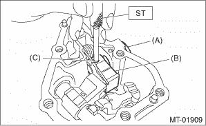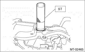 8. Using the ST, install the oil seal. NOTE: • Use a new oil seal. • The illustration shows the oil seal of selector lever COMPL. Perform the same procedures for installing the oil seal of shifter arm No. 2. • Apply transmission gear oil to the oil seal lips.