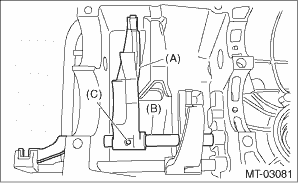 3. Install the 3rd-4th fork rod to the 3rd-4th shifter fork through the hole on the rear of the transmission case. 4. Align the holes on the 3rd-4th fork rod and 3rd-4th shifter fork, and drive the straight pin into these holes using the ST to fix. NOTE: • Use a new straight pin. • Set other fork rods to neutral. • Check that the positions of interlock plunger is correct.