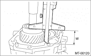 4. Install the taper roller bearing (extension case side) outer race to the transfer driven gear. 5. While pressing the taper roller bearing (extension case side) outer race horizontally, rotate the transfer driven gear for ten turns. 6. Measure the height “W” between transfer case and taper roller bearing (transfer case side) on the transfer driven gear.