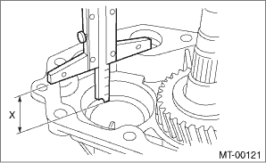 7. Measure the depth “X” of taper roller bearing insertion part of the extension case. NOTE: Measure while the taper roller bearing (extension case side) outer race and the adjusting washer are removed.