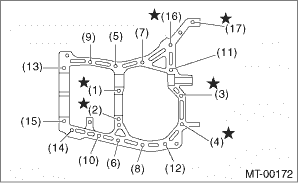 19. Tighten 17 bolts with brackets and clips as shown in the figure. NOTE: • Insert bolts (11) and (16) from the LH side of the transmission case. • Match the cases together so that the drive pinion shims are not caught between the cases. Tightening torque: 8 mm bolt 25 N·m (2.5 kgf-m, 18.4 ft-lb)