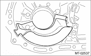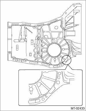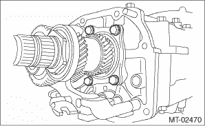 (5) Loosen the differential side retainer on the LH side of the transmission case by 3 notches, and turn the differential side retainer on the RH side of the transmission case by 3 notches in order to apply backlash. (6) Screw in the differential side retainer of the RH side of the transmission case additionally by 1 notch in order to apply preload on taper roller bearing. (7) Tighten temporarily both the retainer lock plates LH and RH, and put marks on both the differential side retainer and retainer lock plate for later readjustment. NOTE: When it is difficult to attach the retainer lock plate, turn over the retainer lock plate and attach. (8) Turn the transmission main shaft several times while tapping around the differential side retainer lightly with a plastic hammer. 13. Inspect and adjust backlash and tooth contact of the hypoid driven gear. Front Differential Assembly > INSPECTION 14. Separate the transmission case into left and right parts. Transmission Case > REMOVAL 15. Check each shifter fork. Shifter Fork and Rod > INSPECTION 16. Select a main shaft rear plate. Main Shaft Assembly > ADJUSTMENT 17. Install the front oil guide. NOTE: Fit in all the way.