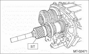 12. Perform backlash adjustment of the hypoid driven gear and preload adjustment of the taper roller bearing. (1) Attach the ST on drive pinion shaft assembly.