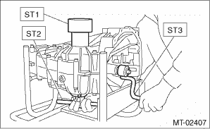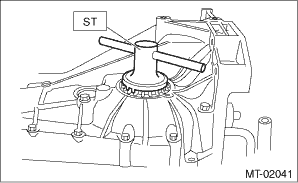 (2) Place the transmission case with the LH side facing downward, and put ST1 on the taper roller bearing outer race. (3) Screw in the differential side retainer from the bottom into left case using ST2. Fit the ST3 on the main shaft of the transmission. Shift the gear into 4th or 5th, and turn the shaft several times. Screw in the differential side retainer while rotating the ST3 until a slight resistance is felt on ST2. This is the contact point of the hypoid driven gear and the drive pinion shaft. Repeat the above sequence several times to ensure the contact point.