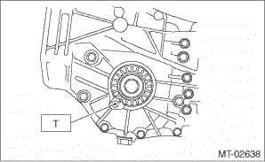 10. Install the taper roller bearing outer race to the RH side of the transmission case. 11. Tighten the bearing mounting bolts. Tightening torque: 30 N·m (3.1 kgf-m, 22.1 ft-lb)