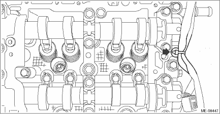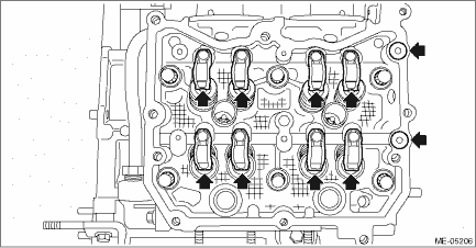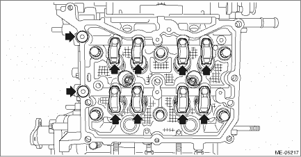 11. Install the rocker cover RH. Rocker Cover > INSTALLATION 12. Install the water pipe assembly RH. Water Pipe Assembly > INSTALLATION 13. Install the fuel injector RH. Fuel Injector > INSTALLATION 14. Install the chain cover. Chain Cover > INSTALLATION 15. Install the engine to the vehicle. Engine Assembly > INSTALLATION 2. CAM CARRIER LH 1. Insert the steel rods into ST, and set the engine so that the camshaft LH is facing up. CAUTION: • If the engine is standing on one side without inserting the steel rod into ST, engine may lose balance and fall down. Be sure to insert the steel rod into ST to extend the length. • Use the steel rod with enough strength. • Be careful not to pinch the engine harness with ST.