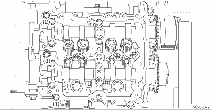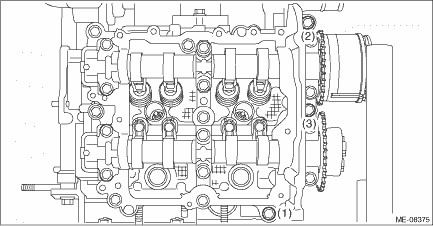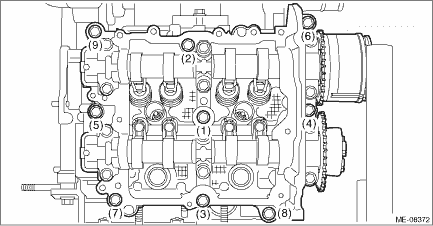 5. Install the cam carrier RH to the cylinder head RH. (1) Mount the cam carrier RH, then tighten all bolts with a torque of 18 N·m (1.8 kgf-m, 13.3 ft-lb) in numerical order as shown in the figure. NOTE: Set the intake camshaft RH and the exhaust camshaft RH to the zero-lift position.