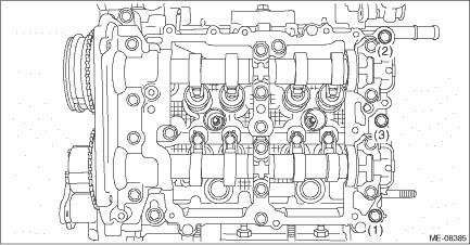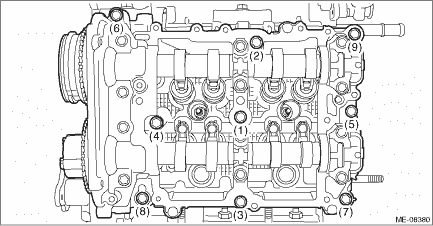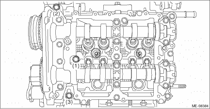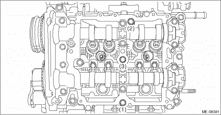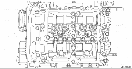 5. Install the cam carrier LH to the cylinder head LH. (1) Mount the cam carrier LH, then tighten all bolts with a torque of 18 N·m (1.8 kgf-m, 13.3 ft-lb) in numerical order as shown in the figure. NOTE: Set the intake camshaft LH and the exhaust camshaft LH to the zero-lift position.