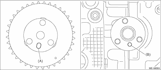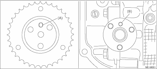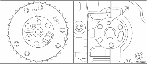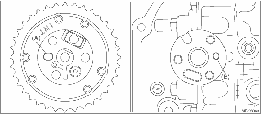 1. CAM SPROCKET RH • Intake cam sprocket RH 1. Install the intake cam sprocket RH by aligning the knock hole (A) of intake cam sprocket RH and the knock pin (B) of intake camshaft RH. NOTE: Before installation, check that there is no foreign matter on the intake cam sprocket RH and intake camshaft RH.