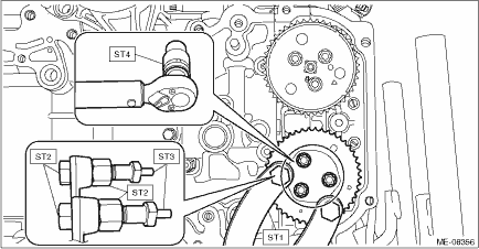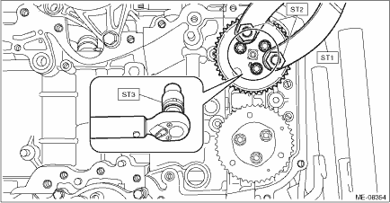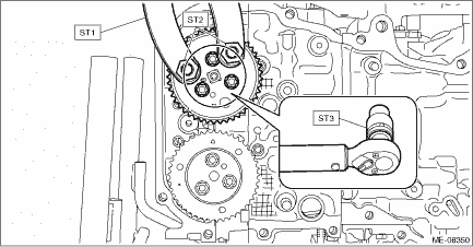 2. Hold the intake cam sprocket RH using the ST1 and ST2, and install the bolts using the ST3. CAUTION: Perform the operation carefully since the ST comes off easily.