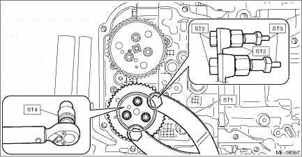 2. Hold the exhaust cam sprocket RH using the ST1, ST2 and ST3, and install the bolts using the ST4.