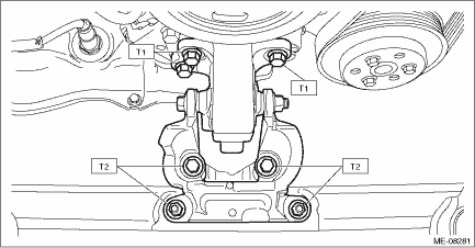 5. Place the front cushion rubber together with the front mounting bracket to the cradle, and install the front cushion rubber to the engine mounting bracket to install the front mounting bracket to the cradle. Tightening torque: T1: 25 N·m (2.5 kgf-m, 18.4 ft-lb) T2: 60 N·m (6.1 kgf-m, 44.3 ft-lb)