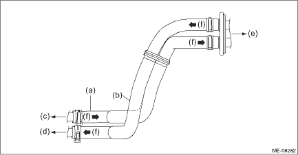 13. Install the front exhaust pipe. Front Exhaust Pipe > INSTALLATION 14. Lower the vehicle. 15. Connect the fuel delivery tube and evaporation hose. (1) Connect the evaporation hose (C). (2) Connect the quick connector of the fuel delivery tube (B) to the fuel pipe assembly, and secure the fuel delivery tube using clip (A). CAUTION: • Check that there is no damage or dust on the quick connector. If necessary, clean the seal surface of the pipe. • Make sure that the quick connector is securely connected.