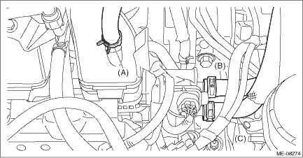18. Connect the brake booster vacuum hose (A), heater inlet hose (B) and heater outlet hose (C). NOTE: Be careful not to mix up the heater inlet hose and the heater outlet hose when connecting them.