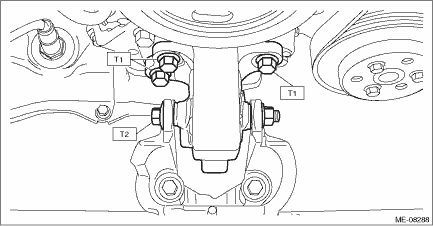 1. FRONT CUSHION RUBBER AND ENGINE MOUNTING BRACKET 1. Install the engine mounting bracket onto the engine. Tightening torque: 30 N·m (3.1 kgf-m, 22.1 ft-lb) 2. Install the front cushion rubber to the front mounting bracket and engine mounting bracket. Tightening torque: T1: 25 N·m (2.5 kgf-m, 18.4 ft-lb) T2: 45 N·m (4.6 kgf-m, 33.2 ft-lb)