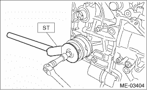 1. Install the cam sprocket. 2. Use the ST to lock the cam sprocket, and install the cam sprocket bolt. Tightening torque: Tighten to a torque of 29.5 N·m (3.0 kgf-m, 21.8 ft-lb), and then tighten further by 45°.