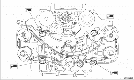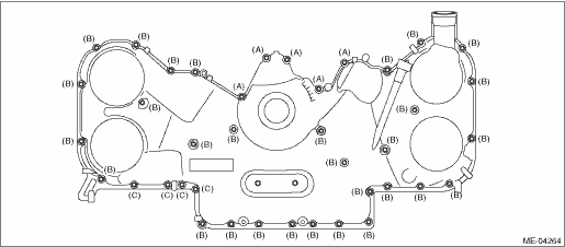 3. Attach the chain cover and temporarily tighten the chain cover installation bolts. CAUTION: Do not install the chain cover installation bolts in wrong place.