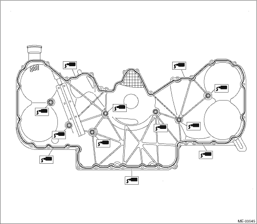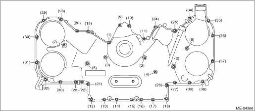 4. Tighten the chain cover installing bolts in the numerical order as shown in the figure. Tightening torque: 10 N·m (1.0 kgf-m, 7.4 ft-lb)