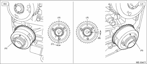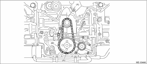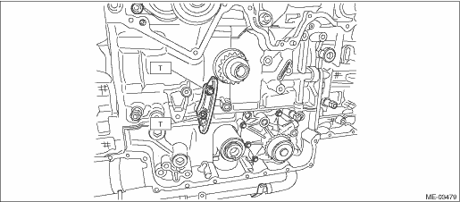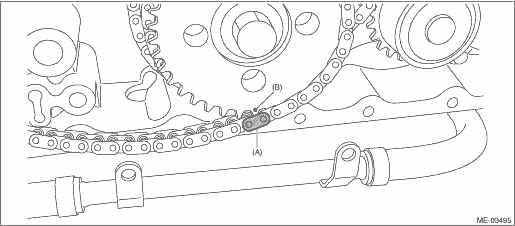 21. After installation, perform the following confirmations. CAUTION: Always make sure to perform this confirmation. (1) Make sure that the timing mark of idler sprocket is aligned to three timing chain marks (gold). (2) Make sure that the twelve o’clock position on the crank sprocket is aligned to the timing chain (main) mark (gold). (3) Make sure that the LH side cam sprocket timing mark is aligned to the timing chain mark (blue). (4) Make sure that the RH side cam sprocket timing mark is aligned to the timing chain mark (blue). (5) Make sure that all bolts are tightened at the specified torque. 22. Using the ST, turn the crankshaft in the direction of engine rotation, and make sure that there are no abnormal conditions. CAUTION: Always make sure to perform this confirmation. 23. Install the chain cover. Chain Cover > INSTALLATION 24. Install the crank pulley. Crank Pulley > INSTALLATION 25. Install the V-belts. V-belt > INSTALLATION 26. Fill engine oil. Engine Oil > REPLACEMENT 27. Make sure there is no oil leaks in the chain cover mating surface. 28. Install the radiator. Radiator > INSTALLATION |