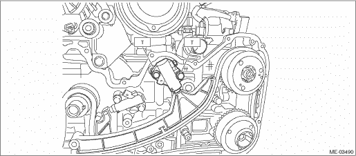 10. Install the chain tensioner (main) and pull out the stopper pin. NOTE: The timing chain (main) line will be complete. Tightening torque: 16 N·m (1.6 kgf-m, 11.8 ft-lb)