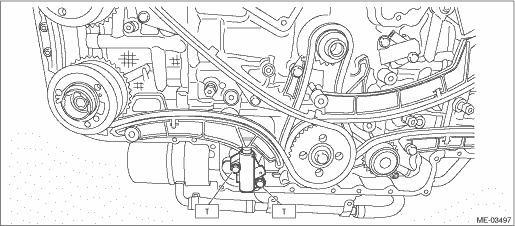 20. Install the chain tensioner (RH) and pull out the stopper pin. NOTE: The timing chain (RH) line will be complete. Tightening torque: 16 N·m (1.6 kgf-m, 11.8 ft-lb)