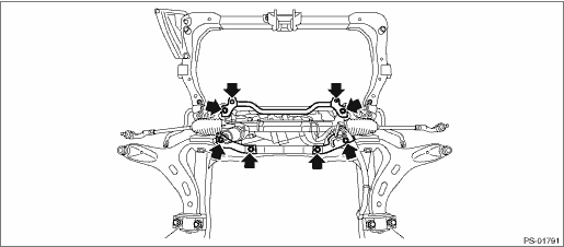 1. Before installation, check the steering gearbox. Electric Power Steering Gearbox > INSPECTION 2. Install the steering gearbox assembly by tightening the bolts through the stiffener to the specified torque. CAUTION: Be careful not to damage the steering gearbox assembly boot. Tightening torque: 60 N·m (6.1 kgf-m, 44.3 ft-lb)