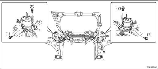 3. Install the main mounting bracket in the numerical order. (1) Temporarily tighten the main mounting bracket in the numerical order. Tightening torque: 10 N·m (1.0 kgf-m, 7.4 ft-lb) (2) Tighten the main mounting bracket in the numerical order. Tightening torque: 60 N·m (6.1 kgf-m, 44.3 ft-lb)