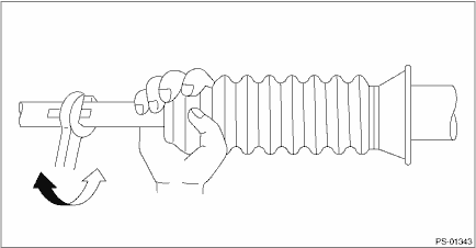 4. Install the cradle. Cradle > INSTALLATION 5. Install the universal joint assembly - steering. Universal Joint > INSTALLATION CAUTION: • Install the cradle first before tightening the universal joint assembly - steering to avoid the steering effort from becoming heavy. • Always install the universal joint assembly - steering after installing the steering column to avoid damage to the universal joint assembly - steering. • Be sure to follow the tightening order and tightening torque of the universal joint assembly - steering to avoid the steering effort from becoming heavy. After confirming that the steering column position is in the neutral position, tighten the universal joint assembly - steering. • Always place the tilt lever to the lock position after the steering column is adjusted. 6. Connect the ground terminal to battery sensor. NOTE 7. After adjusting toe-in and steering angle, tighten the lock nut on tie-rod end. CAUTION: When the wheel alignment has been adjusted, perform the following adjustment. – Lane keep assist learning value clear (model with EyeSight): Clear Active Lane Keep System Learning Value > OPERATION – VDC sensor midpoint setting mode: VDC Control Module and Hydraulic Control Unit (VDCCM&H/U) > ADJUSTMENT Tightening torque: 85 N·m (8.7 kgf-m, 62.7 ft-lb) NOTE: When adjusting toe-in, hold the boot - steering gearbox as shown to prevent it from being rotated or twisted. If it becomes twisted, straighten it.