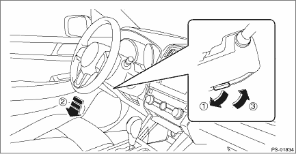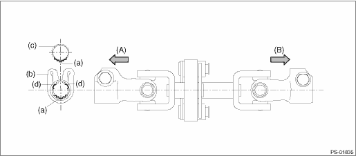 3. Unfasten the seat belt and make the steering wheel turn freely. 4. Install the universal joint assembly - steering to the column shaft. CAUTION: • Be sure to align the protrusion section (a) of the column shaft side with the cutout (a) of the serration. If another cutout portions (d) are used for alignment, the bolt of the universal joint assembly - steering cannot be assembled. • Be sure to follow the tightening order and tightening torque of the universal joint assembly - steering to avoid the steering effort from becoming heavy. After confirming that the steering column position is in the neutral position, tighten the universal joint assembly - steering. • Always place the tilt lever to the lock position after the steering column is adjusted. (1) Match the alignment marks that have been marked when removing with the column shaft (c) and the cutout portion (a) at the serrations of the yoke (b). (2) Connect the universal joint assembly - steering with the column shaft.