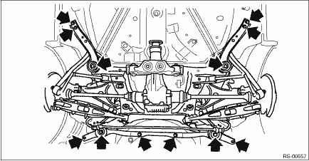 CAUTION: • For parts which are not reusable, always use new parts. • Always tighten the bushing in the state where the vehicle is at curb weight and the wheels are in full contact with the ground. • During the installation, make sure that the marking of ABS wheel speed sensor harness does not twist. 1. Check the removed parts for wear, damage and crack, and repair or replace them if faulty. 2. Install each part to the rear sub frame assembly. Tightening torque: Refer to “COMPONENT” of “General Description” for the tightening torque. General Description > COMPONENT 3. Install the rear sub frame assembly. (1) Lift the rear sub frame assembly using a transmission jack. (2) Install the right and left supports - sub frame and the rear support - sub frame, and install the rear sub frame assembly. CAUTION: • The rear sub frame assembly is heavy. Make sure that it is horizontally-supported. • While checking there is no dragging of harness and wire, raise it slowly with a transmission jack.