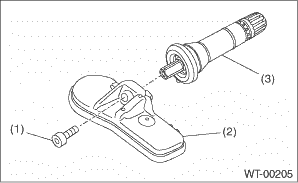1. TRANSMITTER (TIRE INFLATION PRESSURE SENSOR) CAUTION: Use the new transmitter assembly or replace the new valve and screw, when installing. 1. Replace the valve and screw with a new part when reusing transmitter.