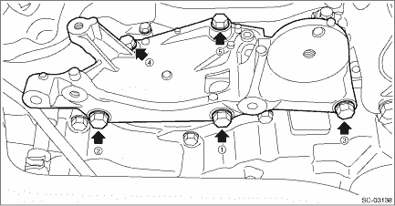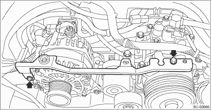 1. Temporarily install the generator bracket to the engine and tighten the bolts in the numerical order. Tightening torque: 36 N·m (3.7 kgf-m, 26.6 ft-lb)